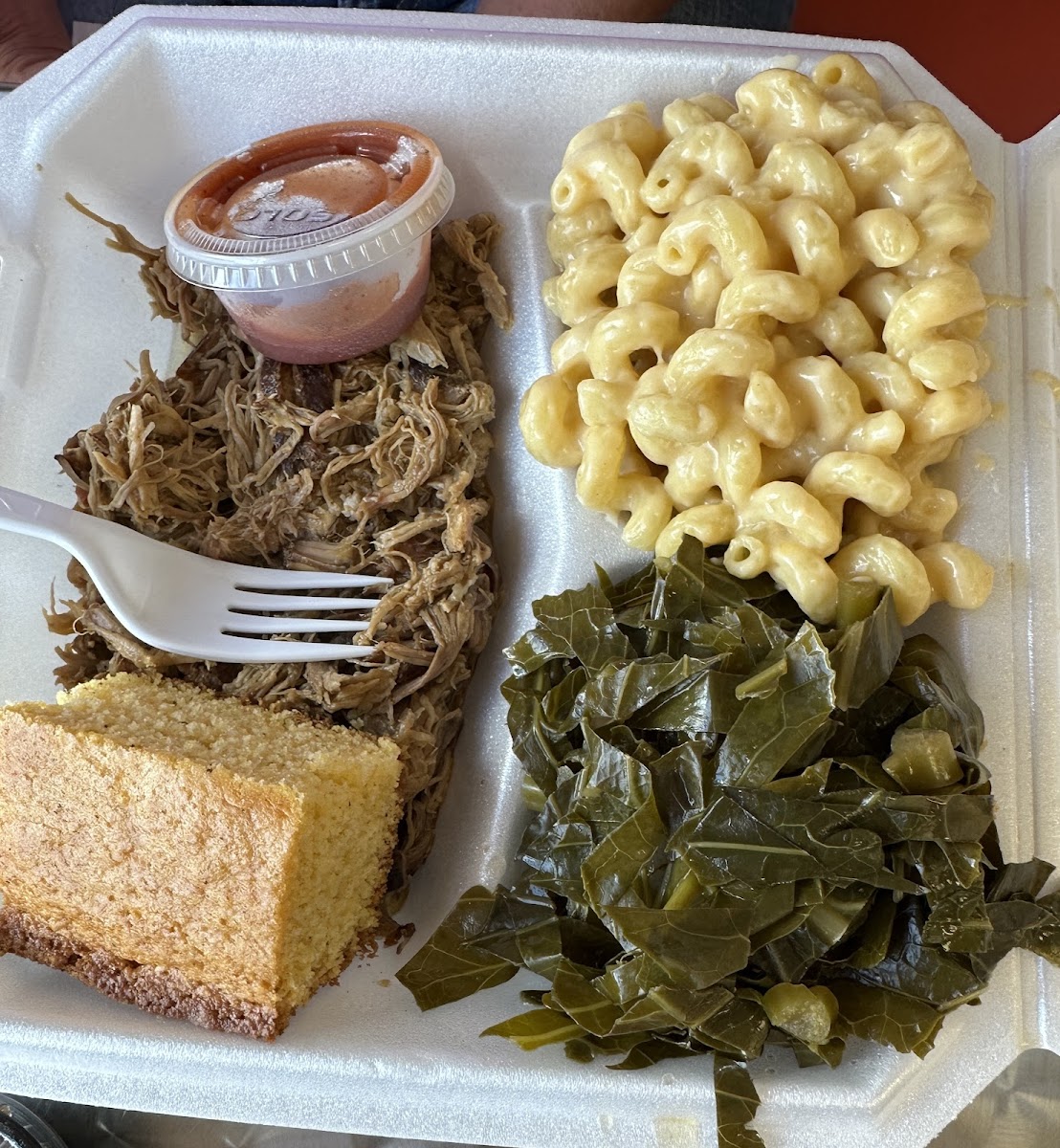 “ This is a small town soulfood spot. I've worked in restaurants for years. This place does it right. The pork is tender and flavorful and the greens are spicey and have a bite to them. The spicy house bbq is hot but not melt your face just open up the sinuses. Mac and cheese made with a legit bechamel some of the best soulfood I've had in years. Couldn't recommend more. ”