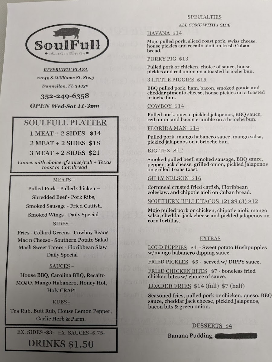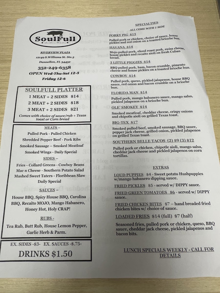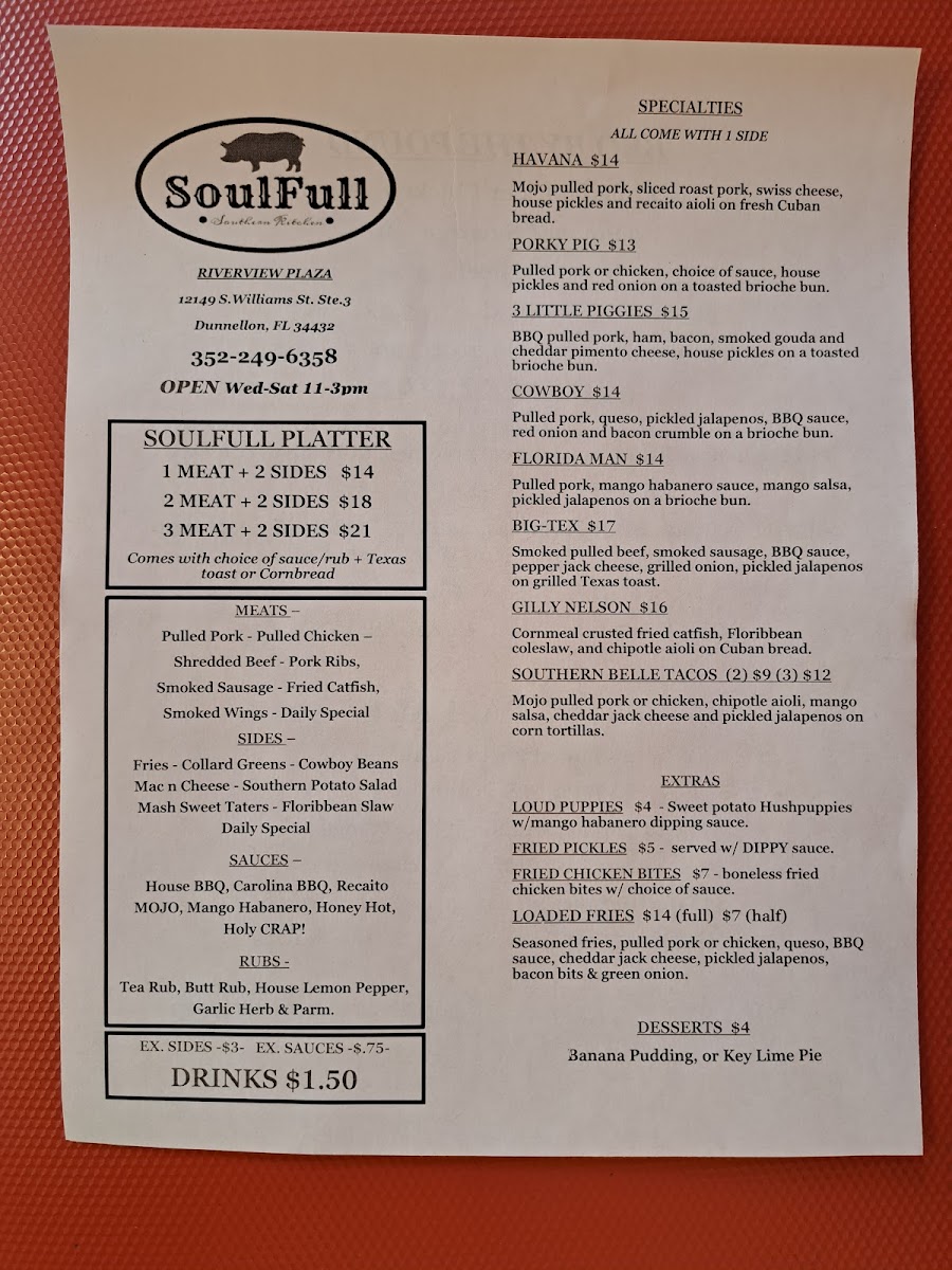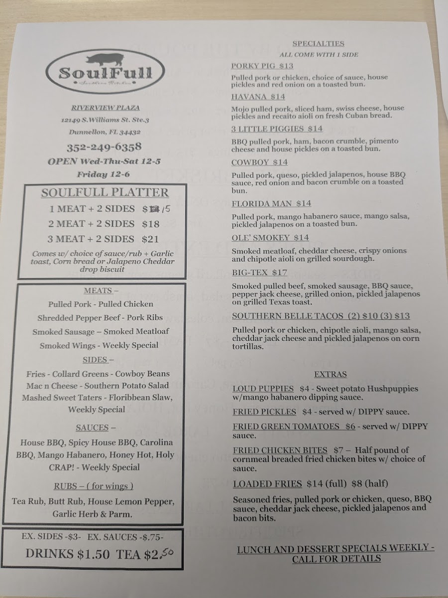 Welcome to Soulfull Southern Kitchen, located at 12149 S Williams St, Dunnellon, FL 34432, where each dish serves as a delectable homage to Southern culinary traditions. Our menu is a tapestry of flavors and textures that bring you the best of Southern hospitality straight to your plate. Prepare your taste buds for a journey with must-try specialties like our Pulled Chicken with Mashed Sweet Potatoes and Pinto Beans. Savor the rich comfort of our Smoked Meatloaf Sandwich paired with our crunchy House Made Pickles, or indulge in crispy Fried Green Tomatoes. For rib lovers, our Rib Tips and St. Louis Ribs with Green Beans and Coleslaw offer a melt-in-your-mouth delight. Dive into the ocean-fresh taste of our Catfish Poboy and Fried Shrimp, and don't miss out on our hearty BBQ Bruschetta with Brisket and Tomato Cucumber Salad. Whether you're settling into our Chicken Wings with Sweet Potato and Cornbread or enjoying a Pulled Pork Platter with Collard Greens, each bite is an invitation to experience true Southern soul. Come on over and let us serve you a slice of the South in the heart of Florida.