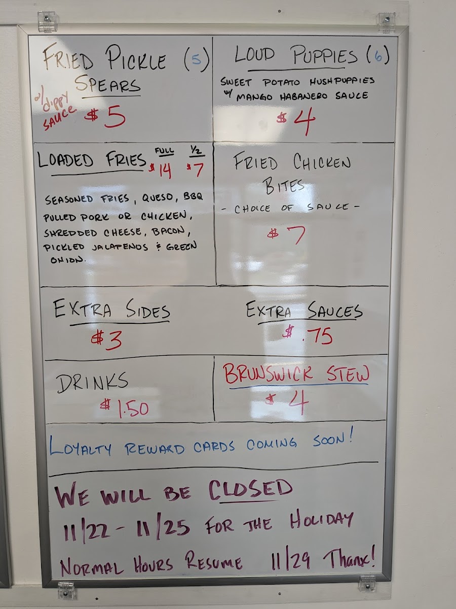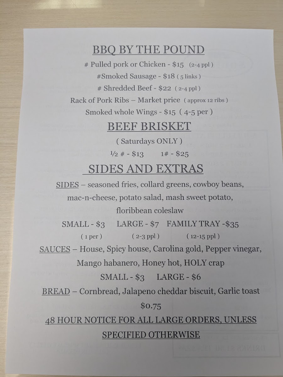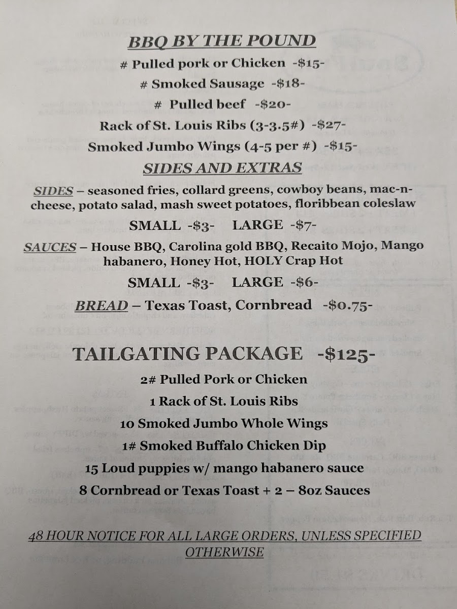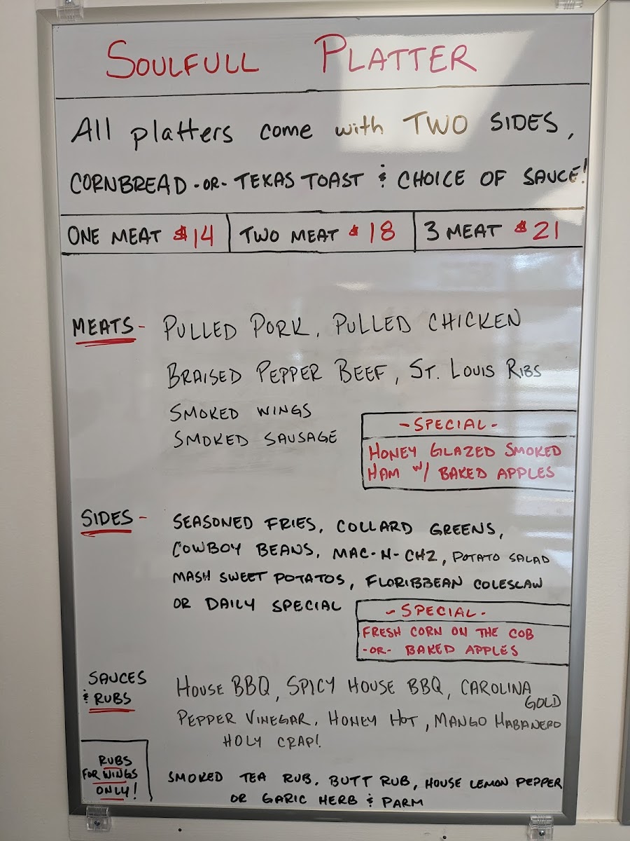 Welcome to Soulfull Southern Kitchen, located at 12149 S Williams St, Dunnellon, FL 34432, where each dish serves as a delectable homage to Southern culinary traditions. Our menu is a tapestry of flavors and textures that bring you the best of Southern hospitality straight to your plate. Prepare your taste buds for a journey with must-try specialties like our Pulled Chicken with Mashed Sweet Potatoes and Pinto Beans. Savor the rich comfort of our Smoked Meatloaf Sandwich paired with our crunchy House Made Pickles, or indulge in crispy Fried Green Tomatoes. For rib lovers, our Rib Tips and St. Louis Ribs with Green Beans and Coleslaw offer a melt-in-your-mouth delight. Dive into the ocean-fresh taste of our Catfish Poboy and Fried Shrimp, and don't miss out on our hearty BBQ Bruschetta with Brisket and Tomato Cucumber Salad. Whether you're settling into our Chicken Wings with Sweet Potato and Cornbread or enjoying a Pulled Pork Platter with Collard Greens, each bite is an invitation to experience true Southern soul. Come on over and let us serve you a slice of the South in the heart of Florida.
